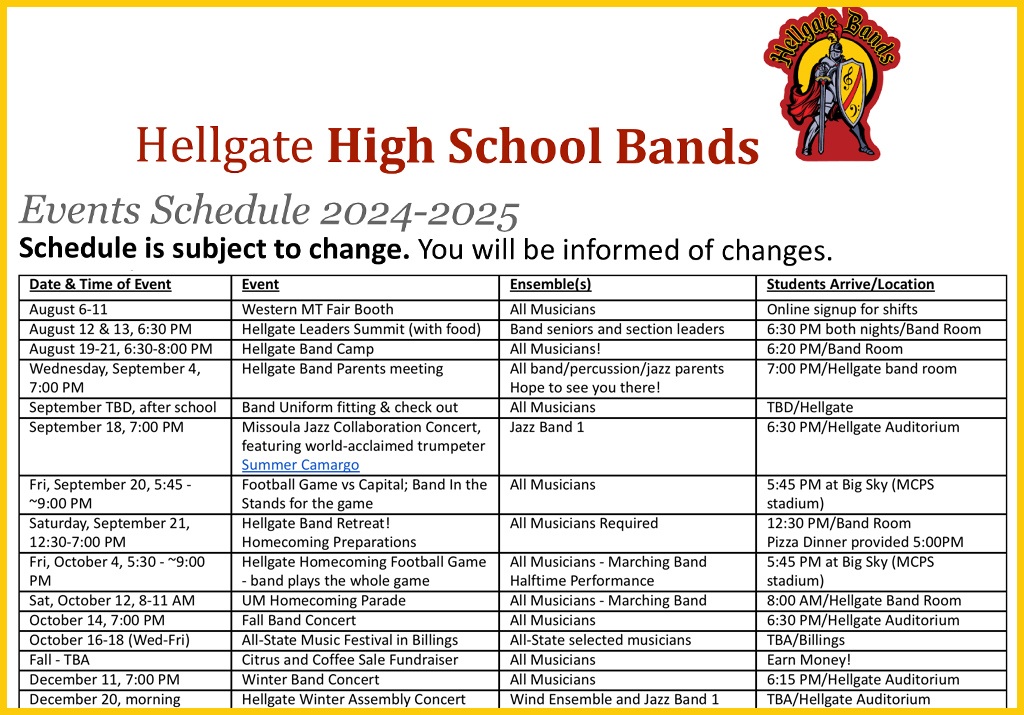 Scheduled events for the year are available in Google Calendar and as a printable spreadsheet. Please note that the pep band schedule will be shared separately to participants.